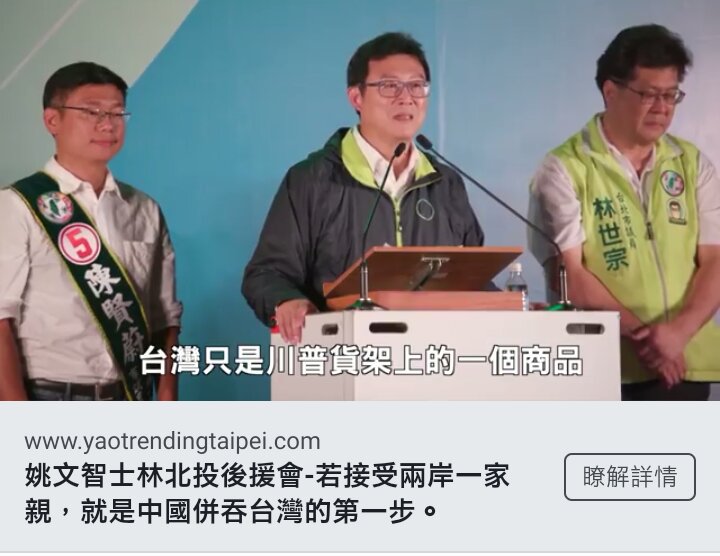 「柯市長我要對你說,你錯了!我們若接受兩岸一家親,就是中國併吞台灣的第一步。柯市長已經選擇了和民進黨、和蔡總統不一樣的道路,我們要拒絕像你這樣的人繼續當我們的首都市長!」