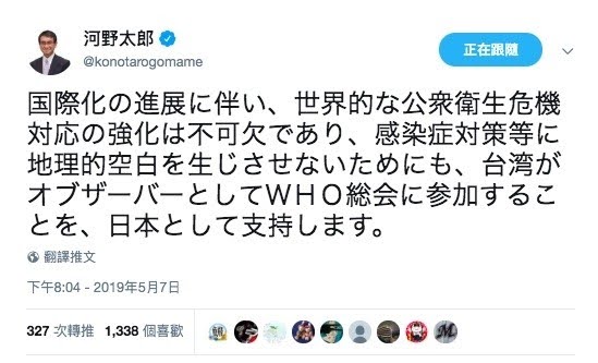 日本首次以直接表述方式支持「台灣」,應作為觀察員參與世衛(WHO)的大會。