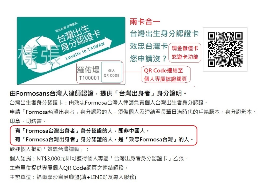 3.由效忠Formosa台灣人律師負責個人台灣出生者身分認證。