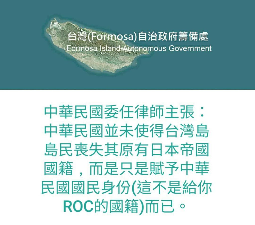 中華民國委任律師主張:「中華民國並未使得台灣島島民喪失其原有日本帝國國籍﹐而是只是賦予中華民國國民身份(這不是給你ROC的國籍)而已。」。顯然係中華民國承認本土島民具有日本國籍﹗so the ROC admits the Plaintiffs still have Japanese nationality: " there has been no denationalization “