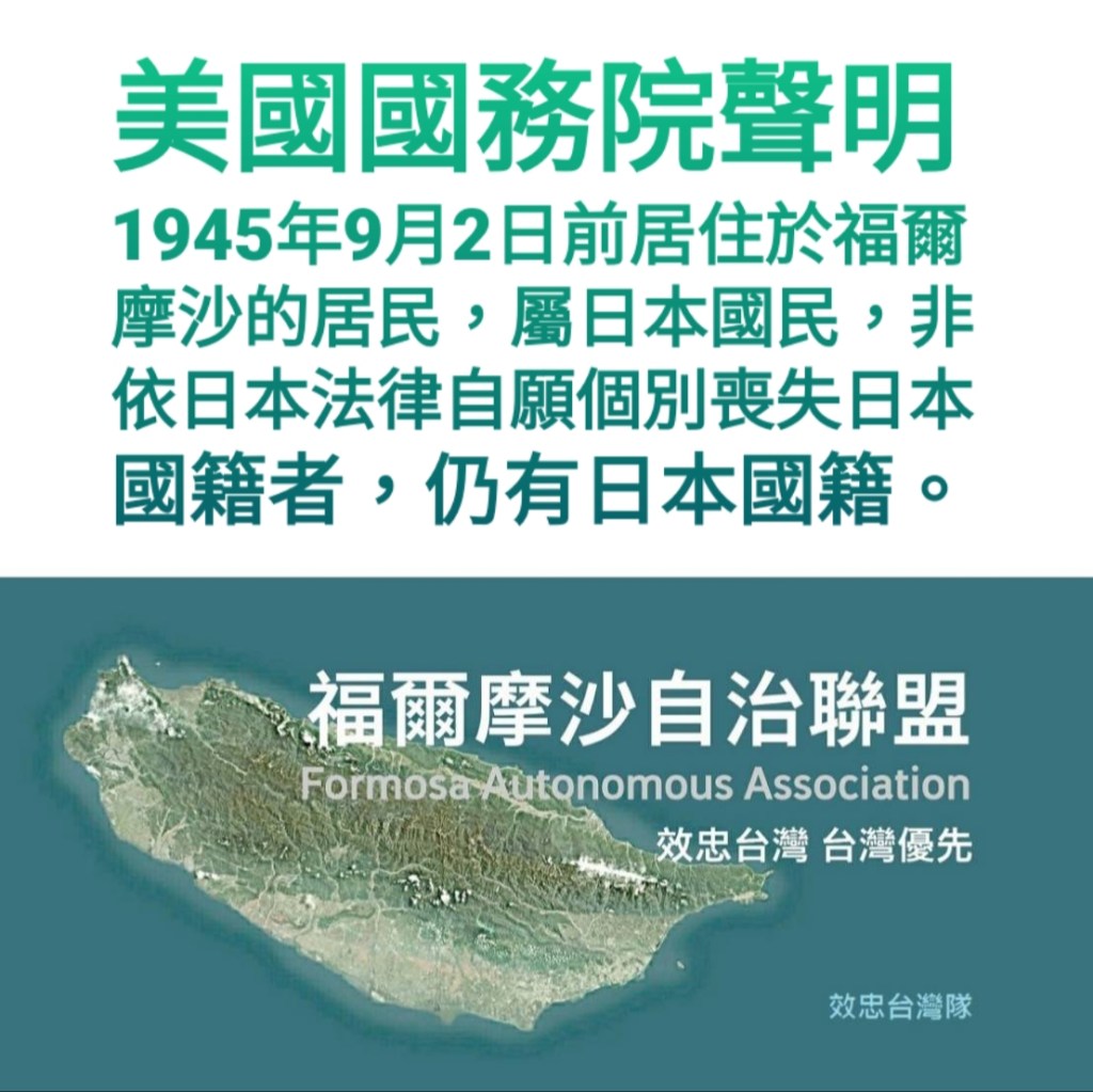 美方國務院聲明台灣島島民屬日本公民除非依日本法自願個別喪失日本國籍…二戰期間他們為聯合國同盟敵人。在日本自稱為台灣人之日本人依法持續持有日本公民國籍﹐除非依據日本國籍法已主動申辦自願喪失日本國籍。
